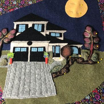 I create one-of-a-kind housewarming gifts featuring fabric replicas of a photograph of the new home.